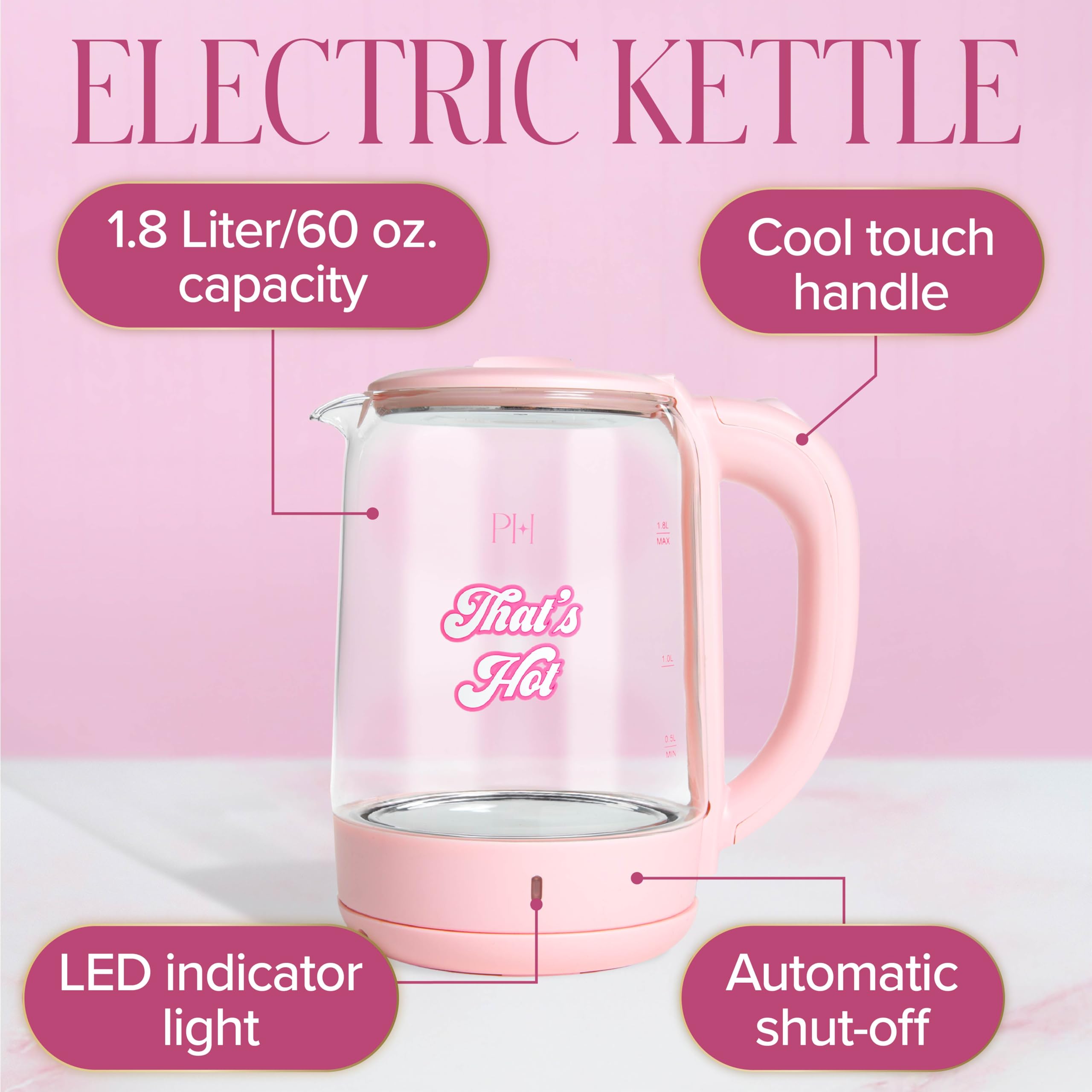 - ICONIC GLAM DESIGN: Featuring a soft pink finish, gold accents, and Paris’s signature “That’s Hot” decal, this electric kettle brings luxe charm to any countertop or dorm room setup.