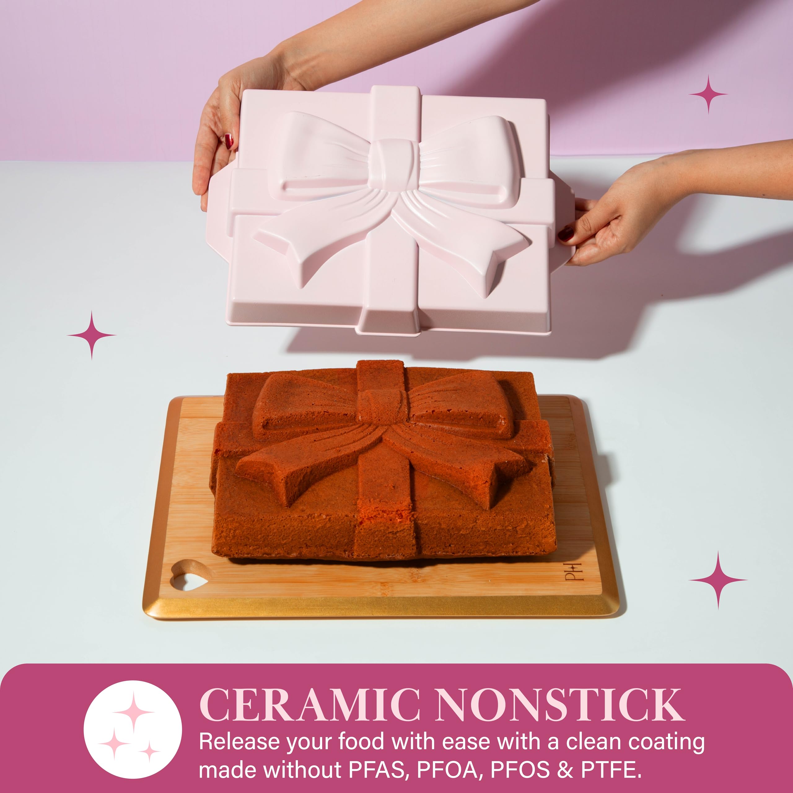 Paris Hilton Gift Box with Bow Cake Pan, Cast Aluminum with Clean Ceramic Nonstick Bakeware, Dishwasher Safe, Made without PFAS, PFOA, PFOS & PFTE, 10.5 x 8-Inch Pink