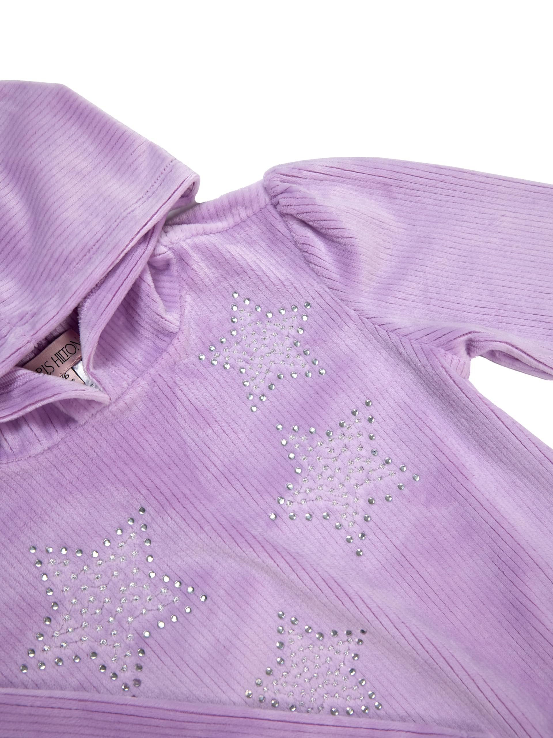 - Top: Hoodie long sleeve sweatshirt with rhinestone star embellishments.