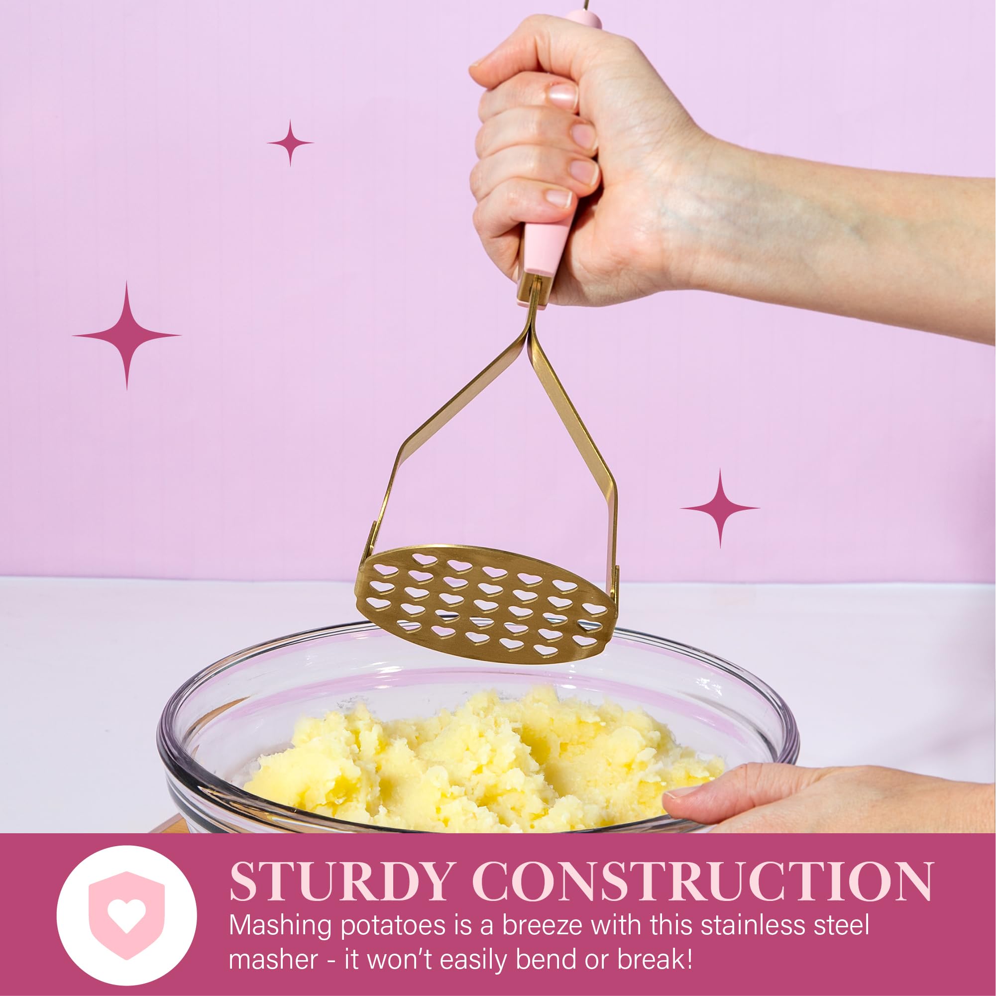 - STYLISH HEART-SHAPED DESIGN: Mash your potatoes and veggies in style with a heart-shaped masher that’s both functional and iconic. That’s hot!