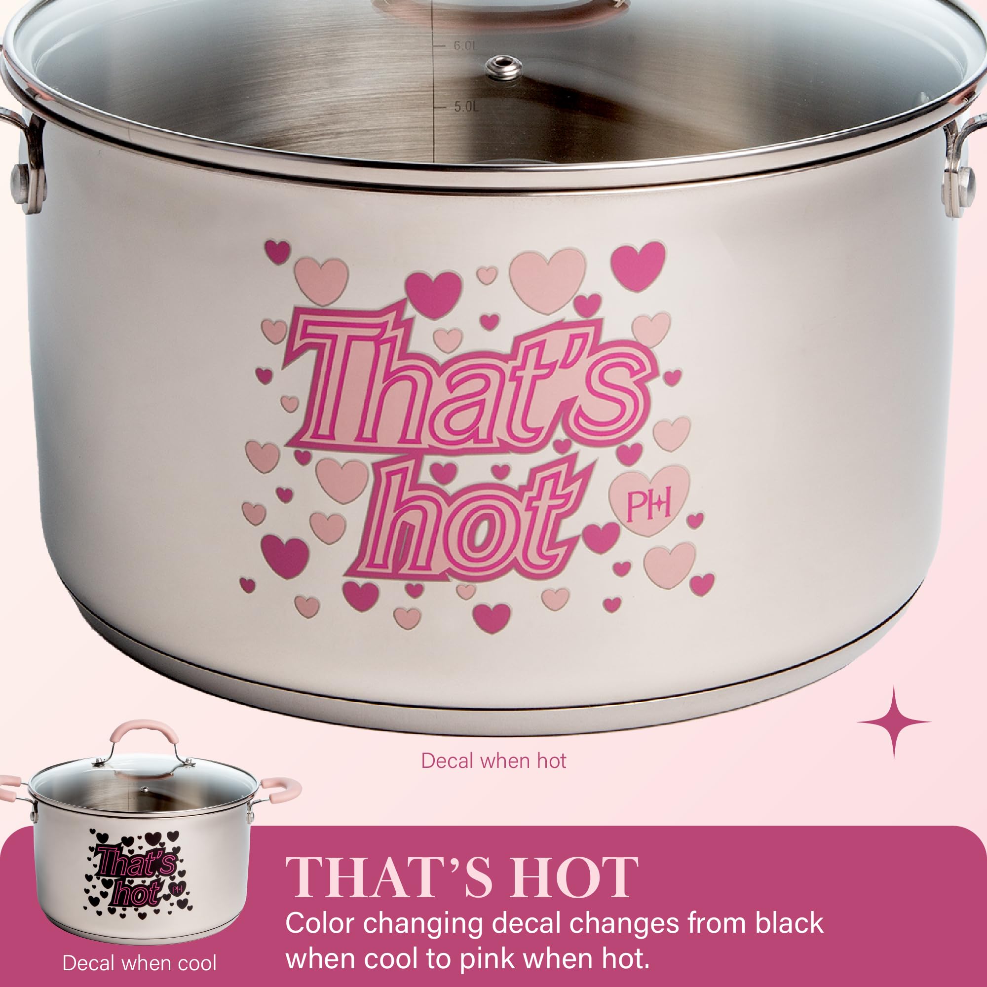 Paris Hilton Stainless Steel Stock Pot with Iconic Color Changing "That's Hot" Heat Indicator Decal, Features Soft Grip Handles and Measure Marks, 8-Quart, Pink